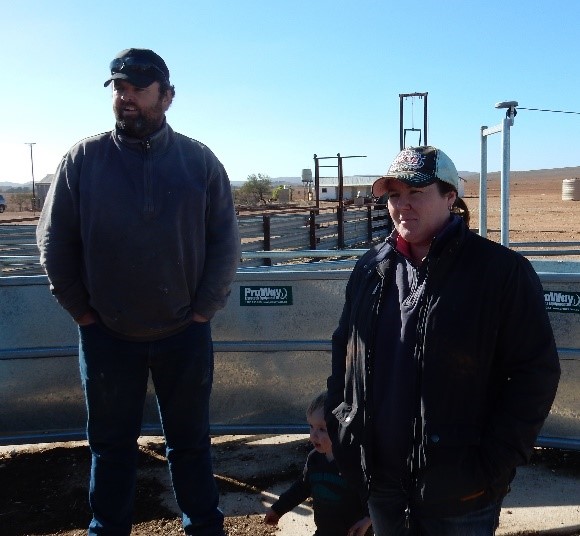 The Clarke’s (Figure 1) own and operate Pine Grove, situated 40 km southeast of Hawker. They manage 6,000 merino ewes with approximately 45% being a self-replacing merino flock with the other 55% mated to terminal sires (White Suffolk) for prime lamb production. All maiden ewes are mated to merino rams. Young ewes are then classed and culls retained and mated to White Suffolk rams, with other ages mated to a mix of merino and White Suffolk rams. Ewes are sold at 6 years of age. Shearing is undertaken in April with ewes lambing in June/July.